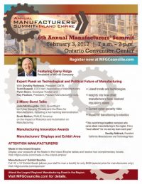 I am the Chair of the Innovation Awards of the Manufacturers’ Summit for the Inland Empire, and we have been quite busy preparing for this Friday’s summit (see below). It is important to encourage innovation for the obvious reason that if we do not innovate, we will stand still. And, if we are standing still, we end up moving backwards while our competition passes us. What have you innovated lately?